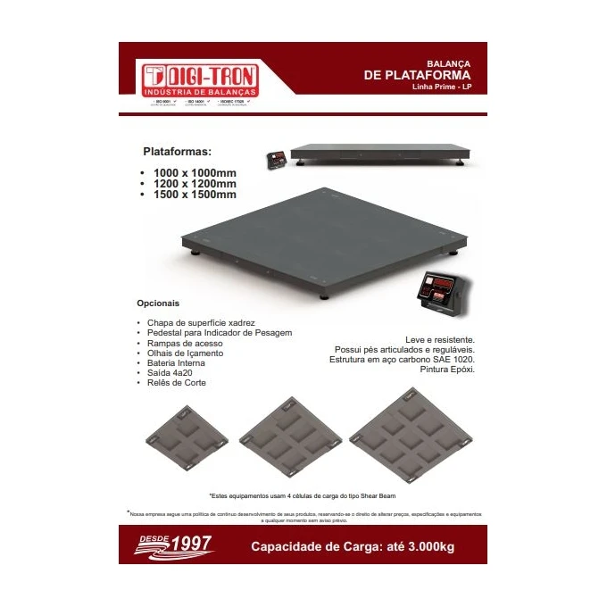 As Balanças de Piso Digi-Tron foram projetadas para atender com precisão, robustez e versatilidade, todas as necessidades operacionais de pesagens de médio e grande portes. De baixo perfil, podem ser instaladas sob ou sobre o piso. Disponíveis em Aço Carbono ou Aço Inox 304. Pés articulados em...